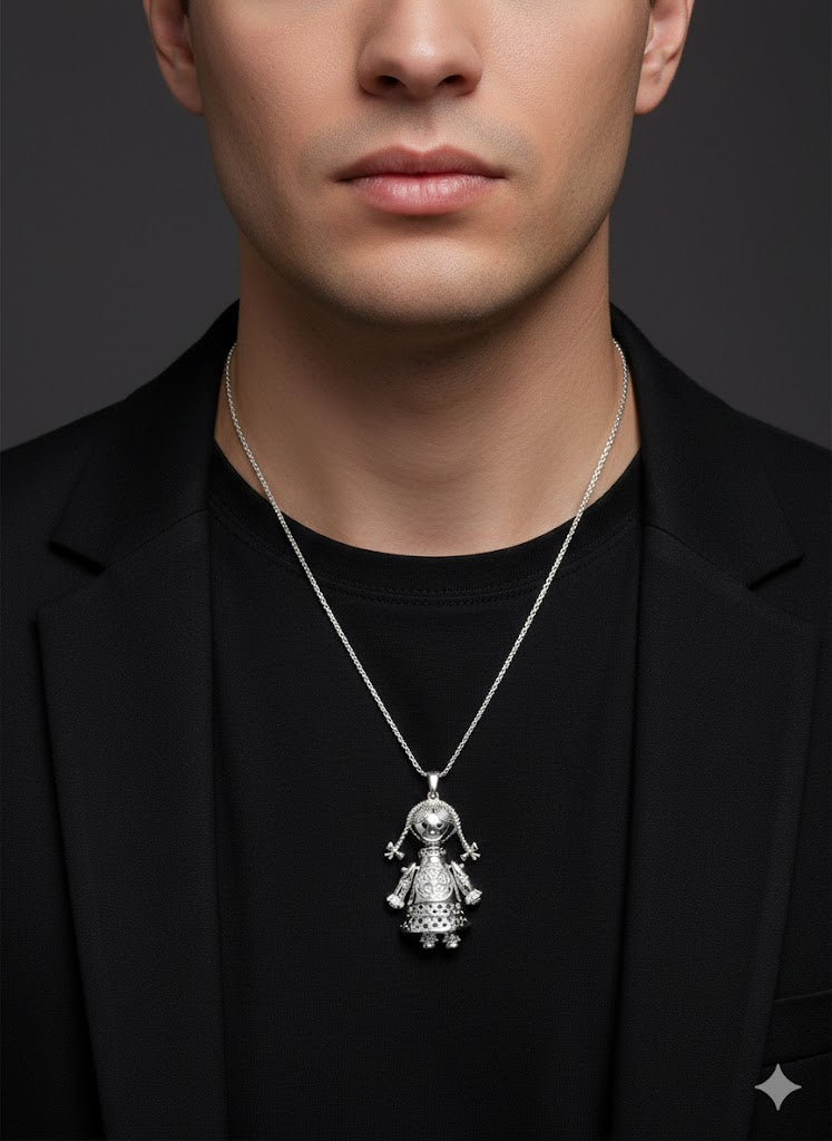 This silver-filled bonded rag doll pendant features a unique doll figure design that adds personality and artistic charm to any outfit. With its distinctive form and clean silver finish, this pendant stands out as a creative and expressive jewelry piece.